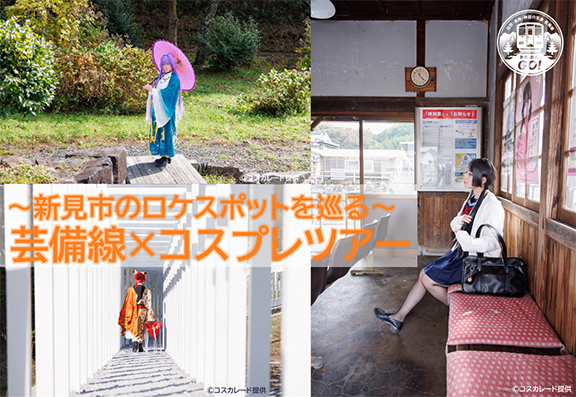 コスプレをして、レトロな駅舎の野馳駅や白い鳥居の連なる済渡寺などの新見市のロケスポットを巡るツアーを実施します。